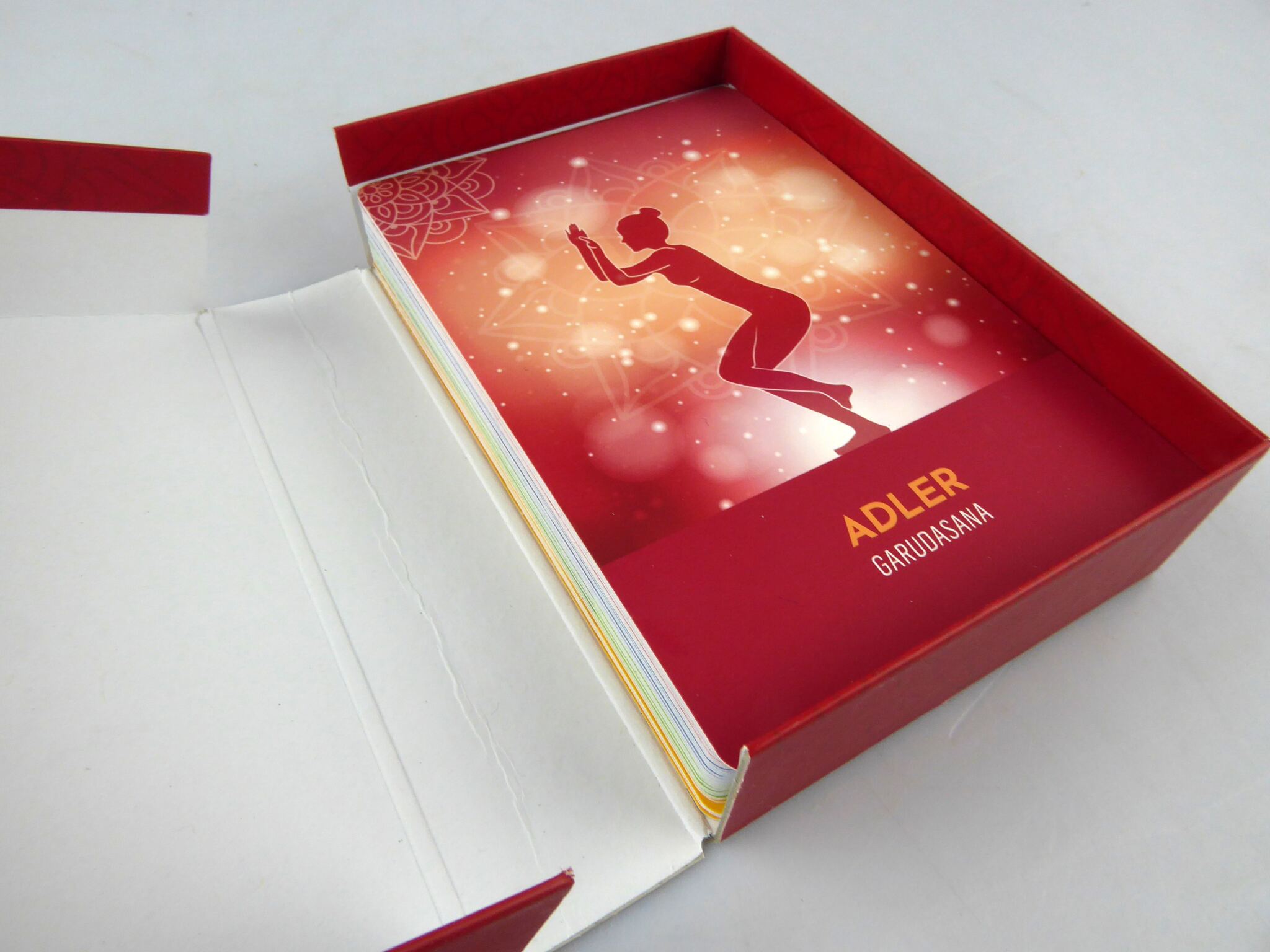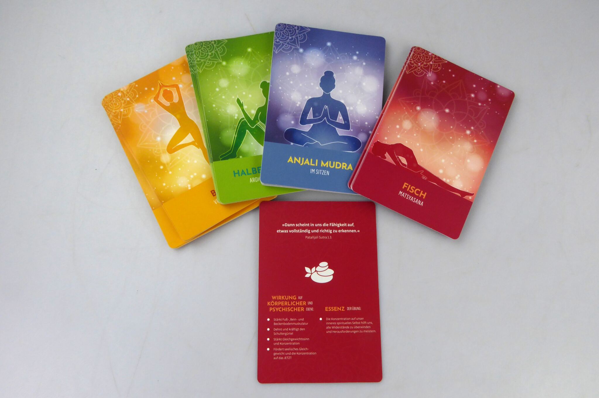Dieses Kartenset ist ein kleiner Schatz wertvollen Yoga-Wissens! Es vermittelt die Anwendung und die heilsamen Wirkungen ausgesuchter praktischer Übungen (Asanas) für Körper und Psyche und verbindet dies mit liebevoll ausgewählten Zitaten aus dem klassischen Yoga-Text des Patañjali. Ein gelungenes Zusammenspiel aus philosophischen Einstimmungen und Affirmationen und heilsamen Körperübungen – 48 praktische Yoga-Inspirationen als Wegbegleiter durch den Alltag, die nochmals farblich unterteilt sind, entsprechend ihrer Wirkung auf Körper, Seele und Geist.