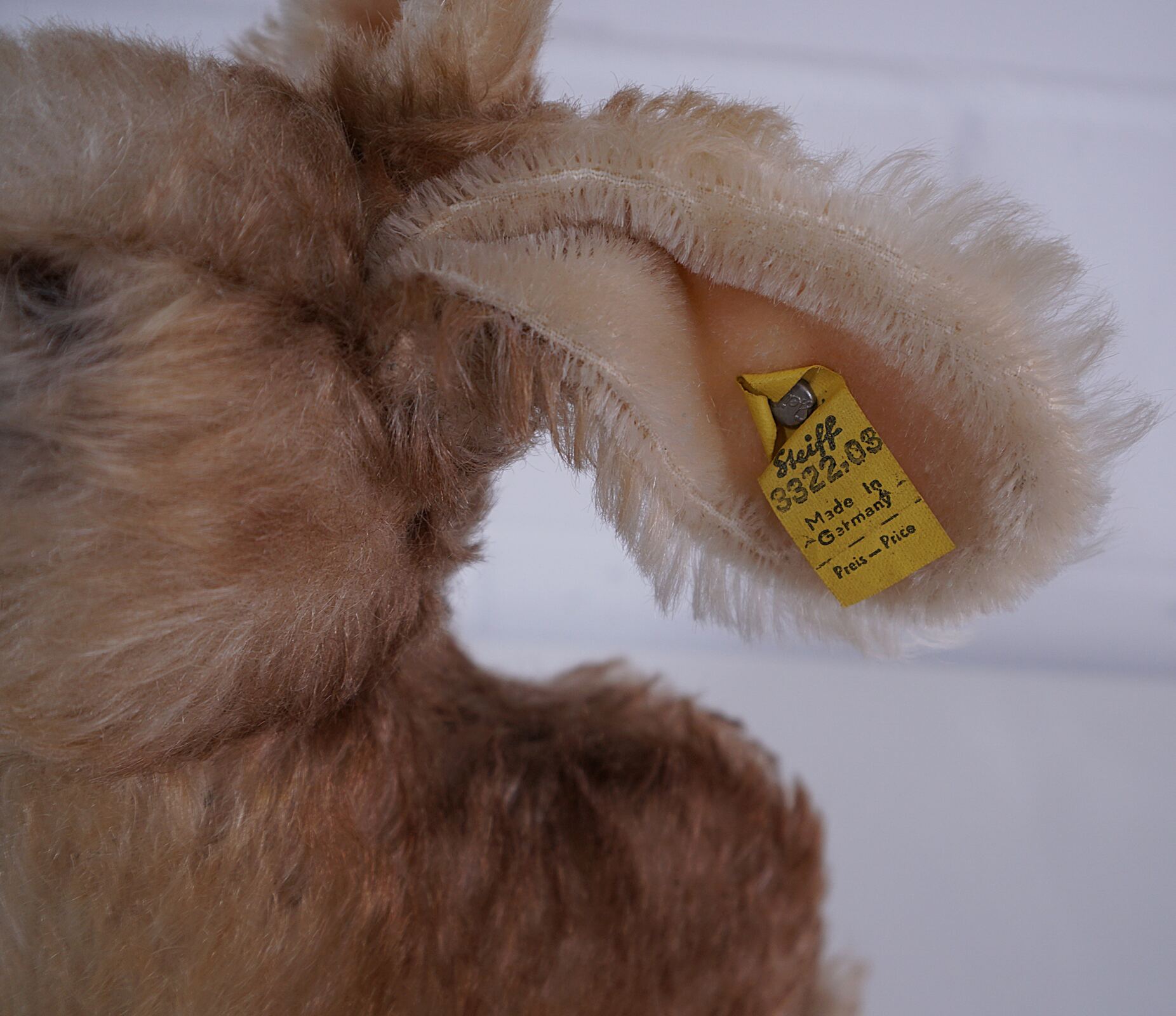 Wunderschöner, seltener Vintage Steiff Hase mit der originalen Artikelnummer 3322-03 auf der gelben Ohrfahne. Dieses Exemplar stammt vermutlich aus den späten 1950er bis 1960er Jahren.