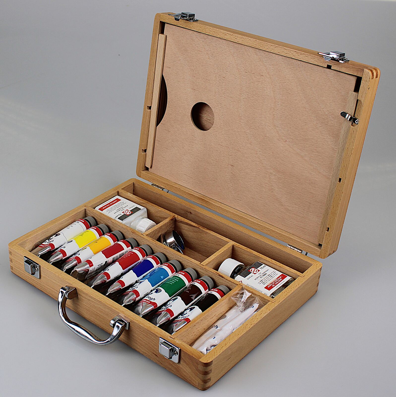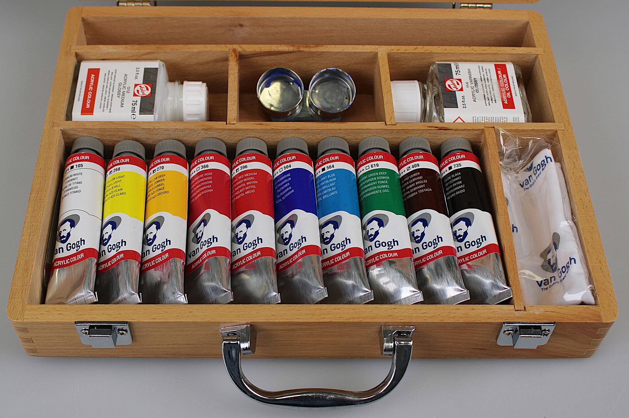 Hochwertiges Acrylfarben-Set der Traditionsmarke Van Gogh (Royal Talens). Das Set ist ideal für Einsteiger sowie ambitionierte Hobbykünstler und kommt in einem robusten, eleganten Koffer aus Holz daher.
