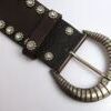 Stylisher breiter Gürtel von Nanni gearbeitet aus geprägten sehr dunkelbraunem Leder mit Strasssteinen und Nieten besetzt. Der Gürtel hat insgesamt eine glatte, geschmeidige Haptik. Aufwändig gearbeitet ist auch die grosse Schnalle aus Metall.